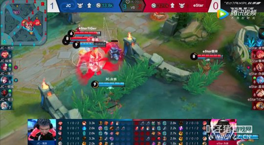 8分18秒eStar发动团战进攻JC中路防御塔,随后抓住了JC的辅助姜子牙,虞姬的大招接上鬼谷子的技能控制,直接秒杀了JC的姜子牙。