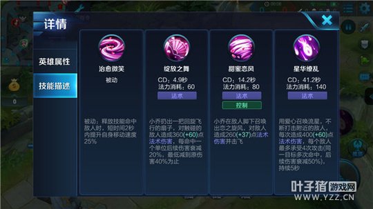 一技能(绽放之舞):该技能是小乔的关键技能,也是主加点技能。该技能攻击距离远、伤害高,让小乔有很强的消耗能力,在开团前小乔能利用该技能不断消耗敌方。如果发育得好,中后期利用该技能命中敌方英雄,便可以达到一扇半血的效果。