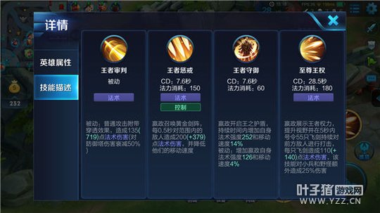 解析:增加一个护盾,护盾存在期间增加自身法术强度和移动速度,被动:增加嬴政法术强度和移速。建议出门就加该技能,不仅能获得护盾增加对线优势,还可以增加法强及移速,也为中路支援边路带来了更多的可能,且随着技能的升级各项属性都会获得不同程度的增加。