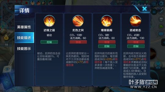 后羿的攻击会让目标减速,并且减速效果可以叠加。被动技能和大招的控制是后羿的核心技能。后羿的被动技能让其等于天生自带红BUFF,减速效果对于射手这类依靠高速普通攻击打输出的英雄是非常重要的,所以大部分射手都会去打红BUFF,但是后羿天生就带减速效果,相对其他射手有先天优势。在追击敌人时可利用普通攻击减速让敌人难以逃跑,或者被敌人追击时可以利用普通攻击减速敌人,配合走位风筝对手。如果后羿拿到红BUFF,双重减速效果加持下,除非是像李白或者韩信这类非常灵活的英雄,不然很难有人能在后羿的箭下逃脱。