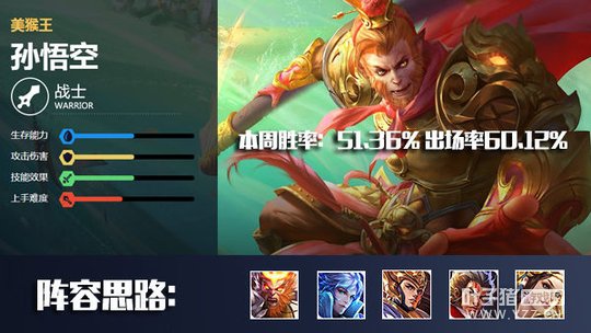 孙悟空在王者荣耀中一直都是非常热门的战士英雄,大招的强控效果与自身技能的加速效果,是他获得玩家喜爱的关键所在。下面从上周孙悟空的出场率以及胜率上为大家分析一下,看看是否符合大家心中所想。
