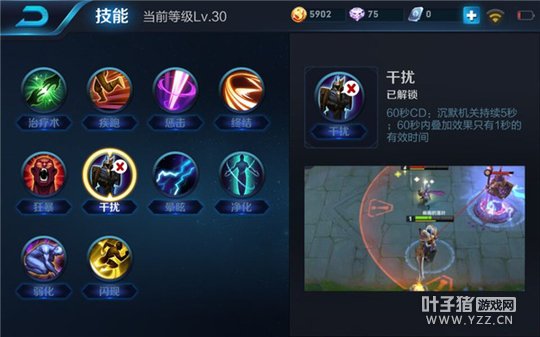 干扰能沉默敌方机关,作用和刘禅的一、二技能相同,方便己方推塔或越塔强杀。特别是前中期这段时间内,敌人为了发育不会频繁回城,残血之后一般猥琐塔内。这时,刘禅如果是携带干扰,那么自身就相当于拥有三次干扰机会,就有充足的时间对其塔内强杀,就算敌人残血便回城补血,也正好方便了己方推塔。
