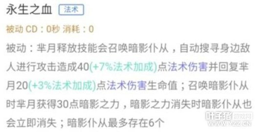 芈月释放技能后召唤的暗影仆从会吸取敌方生命来补充自身,而仆从最多存在6个。芈月的血量下方的紫条代表着暗影之力,暗影之力随着时间而减少,而若是紫条耗光,仆从也随之消失。