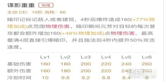 数值分析:基础伤害随着等级提升而增加,后期基础伤害达到了260,暗印期间对目标造成的普攻额外伤害达到了260,后期冷却8秒一次,让李元芳推塔和入场团战伤害都非常高,根据数值的显示,一技能基础伤害很高,冷却时间和二技能一样,所以主一技能能够让自己的伤害最大化。