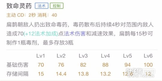 基础分析:扁鹊扔出毒药造成范围区域内减速与四秒内每秒伤害并叠加印记。可以储存三瓶毒药。储存时间受技能冷却时间影响。一技能是扁鹊在团战中快速叠毒的保证,也可以用来限制敌方后排走位,并且释放之后可取消普攻前摇,释放一技能后快速接普攻可以更快的叠加印记。