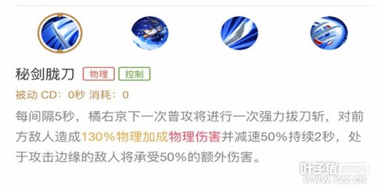 解析:每间隔五秒,橘右京的下次普攻会得到加强,对前方敌人造成物理伤害与减速效果,处于攻击边缘的敌人遭受额外50%的伤害。此技能攻击距离远,适用于远程消耗与留人。使用时控制好距离,打出更多的伤害。