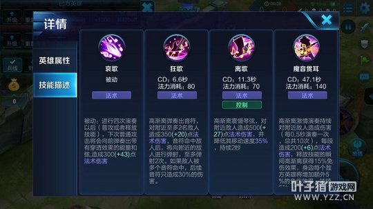 魔音贯耳(三技能):高渐离弹奏音乐,对附近范围内的敌人造成持续伤害,同时获得免伤效果的加持并短时间内提升移速。作为高渐离的主力输出技能,魔音贯耳的攻击值十分可观,在开团时,配合二技能合理使用,能够收掉敌方法师位或是射手位英雄,削弱敌方输出力,为我方队友争取更好的攻击机会。