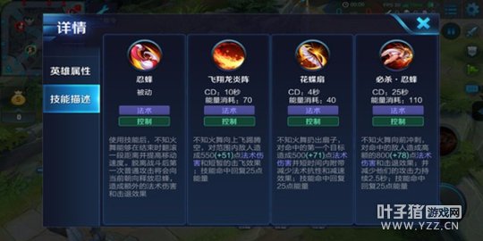 解析:不知火舞向指定方向扔出扇子,对命中单位造成法术伤害并且附带减速效果。该技能是火舞主要的输出技能,尤其是该技能CD极短,命中单位后会恢复能量值,因此火舞可以长时间的使用该技能消耗敌人,附带的减速效果使得敌人很难追上火舞,在面对敌方坦克类英雄时,火舞可以长时间的与其纠缠,使其打之无力,跑之不能。