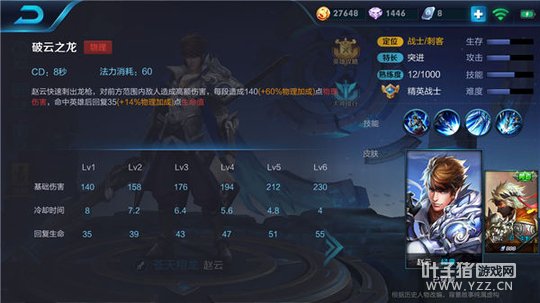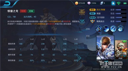 解析及其实战应用:一技能是赵云没有大招前的重要技能,也是四级前的唯一一个位移技能,重要程度可想而知,且不仅仅拥有位移,还会重置下次的普通攻击,造成额外的伤害还拥有减速效果。一技能是赵云的主要输出来源,也是赵云追击敌人时非常好用的技能,重置普通攻击后的减速效果,前期抓人时会降低敌军的逃跑能力,使得赵云击杀敌方英雄更加容易,更能帮助自己及友军建立优势。在实战中使用一技能穿墙时,一定要注意墙的厚度,避免撞墙