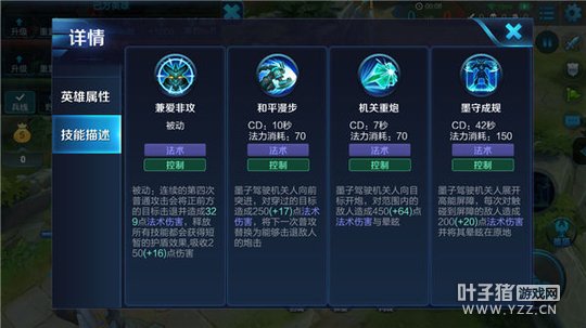 墨子的技能具有强大的控制效果,墨子的一技能可以让自己向指定方向位移,并且立即强化下一次的普通攻击,使得下次普通攻击变为炮击,能够击退敌人。当墨子被敌人围攻时,可以利用自己的一技能迅速的脱离人群,与敌人对战时,当敌人距离墨子的位置较远,墨子可以释放自己的一技能来到敌人的面前,随后释放大招立即控住敌人。