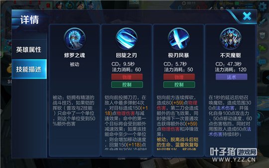 铠向前投掷刀刃,在敌人之间进行弹射,对目标造成物理伤害并回复自身生命值。实战中该技能是铠续航能力的保障,也是追击与逃跑的重要利器。