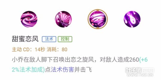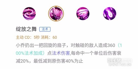 整体分析:此技能是小乔最经常用也是全局中对敌方造成累计伤害最大的技能,非常关键。后期高基础伤害以及百分百的法术加成,使得全法输出小乔的伤害非常可观。