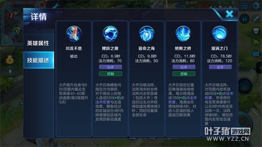 技能解析:三技能是大乔不错的AOE控制技能,可以对区域内的敌人造成持续的法术伤害和沉默效果,在团战中大范围的沉默可以限制敌人的输出和逃生能力,给队友提供不错的输出空间。只有三技能和大招会随着加点减少技能CD,可以优先升级。三技能的初始伤害虽然不高,但是持续命中伤害很高。