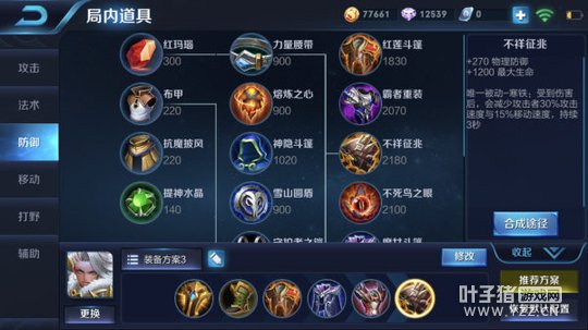 六神装备:近卫荣耀、影忍之足、红莲斗篷、魔女斗篷、反伤刺甲、不祥征兆