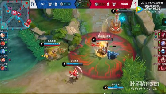 比赛开始时,吕布选择辅助位,配合扁鹊持续对GK方红BUFF区域进行骚扰,利用一技能迂回输出,经过一番拉锯战后选择撤离。当敌方英雄站位分散后,成功偷取中线附近野区资源。表面看来双方持平,但AS仙阁野区资源未被干扰,资源优势已经开始倾斜。