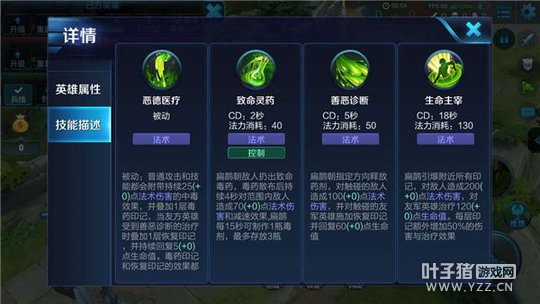 被动-恶德医疗:扁鹊的普攻和技能都会附带中毒效果,并对目标叠加一层毒药印记。但友方英雄受到扁鹊二技能的治疗时,将被叠加一层恢复印记,并持续恢复生命值。两种印记效果都可多次叠加,但有上限。
