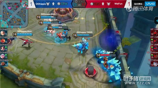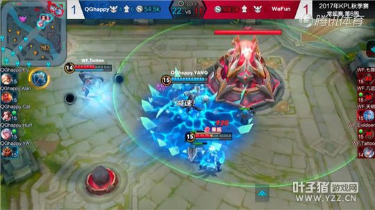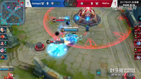 2017年KPL秋季赛QGhappy对战WeFun的比赛中,双方在WF的野区经过一波团战之后各有消耗,此时QG的兵线已经进入到WF的水晶处,而WF诸葛亮想要将兵线清掉,此时QG关羽强势入场,先是用自己的大招将想要回水晶清兵线的诸葛亮往外击退,而后在诸葛亮释放二技能位移躲开关羽的追击之后,关羽利用二技能再次来到诸葛亮的面前并用自己冲锋姿态下的冲撞将诸葛亮击退到队友的位置,紧接着释放自己的一技能将诸葛亮直接劈成残血,而后诸葛亮被队友收割,此时WF的东皇太一想要牵制关羽,但是在此被关羽的一技能给劈到高地位置,随后关羽用自己冲锋姿态下的重装再次控住东皇太一,使东皇太一无法回到水晶处清理兵线,从而帮助队友一波推掉了水晶,赢得了比赛的胜利。