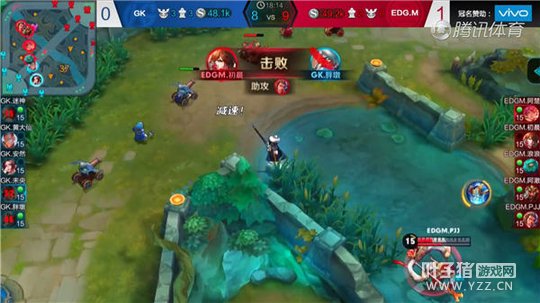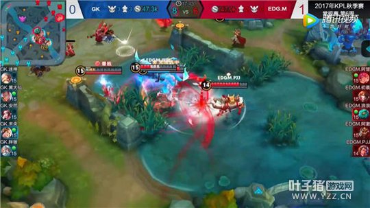 在2017年KPL秋季赛GK对战EDG.M的比赛中,双方在中路的河道选择了团战,此时EDG众人的局面稍微处于劣势,而EDG的李白此时赶到了现场,随后用自身超高的攻速在小兵身上刷了三次普通攻击,随后利用自己的一技能来到敌方老夫子的面前,并释放自己的二技能将老夫子减速,而后利用自己的大招,攻击范围内的多名敌人,迫使敌人在血量较少的情况下只能选择撤退,随后李白来到主宰处想要拿下主宰,但发现中路队友被敌人牵制后,迅速用自己的一技能来到队友面前并释放大招攻击敌人,将敌人逼退,随后回到原地时看到了敌方的姜子牙,紧接着李白用一技能追上姜子牙并用二技能将其减速,随后用寒冰惩击将姜子牙击杀。
