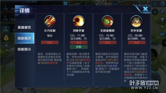 一技能-河豚手雷:鲁班七号朝指定区域投掷手雷,对命中目标造成物理伤害与减速效果,若命中目标处于手雷中心则会受到晕眩效果,并使下一次普通攻击升级为扫射。