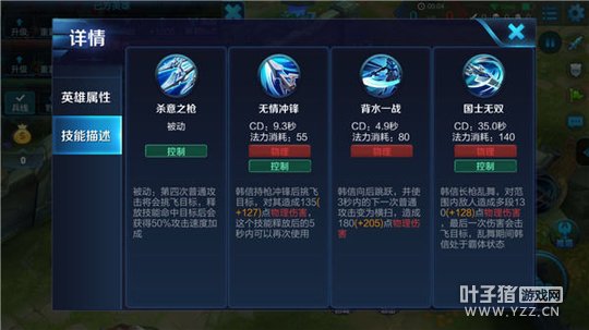 一技能-无情冲锋:韩信持枪冲锋后将挑飞目标,并造成物理伤害,该技能在释放后能在短时间内再次使用。