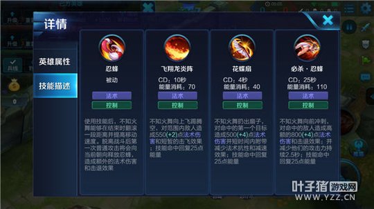 一技能-飞翔龙炎阵:不知火舞向上飞踢腾空,对范围内敌人造成法术伤害和短暂的击飞效果,技能命中敌人时能回复一定的能量值。