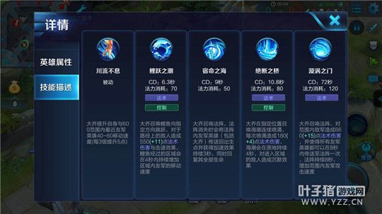二技能-宿命之海:大乔召唤法阵持续一段时间,法阵消失的同时会将法阵内的友军英雄(包括大乔)传送回城,并瞬间回复全部血量,同时获得移速加成。