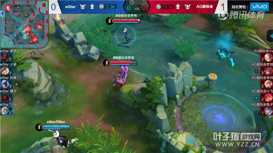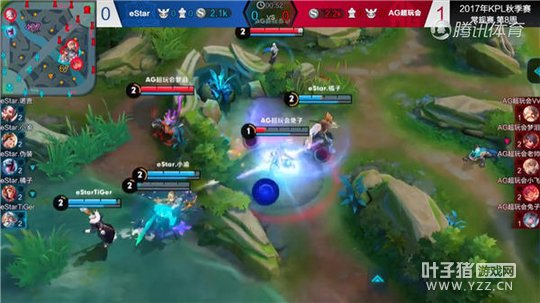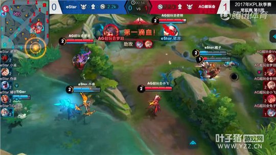 在一场AG超玩会与eStar的比赛中,双方各自四人在AG超玩会的蓝BUFF野区相遇,此时AG超玩会的李元芳迅速将自己的一技能扔到了敌方曹操的身上,随后利用普通攻击将一技能引爆,并将曹操打成残血,而后残血的曹操被李元芳收割,此时敌方的杨戬想要强行对李元芳发起攻击,但是无奈AG超玩会的人数太多,所以杨戬想要撤退,但是李元芳并没有给杨戬这个机会,先是释放自己的二技能接近杨戬,随后利用自己的普通攻击狂点杨戬,将杨戬打成了残血,而后李元芳配合队友将杨戬击杀。