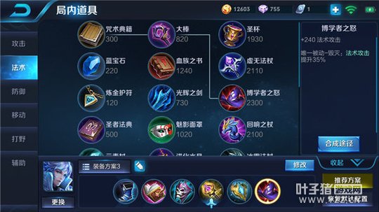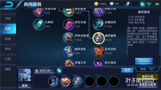 中期推荐装备:秘法之靴、噬神之书、痛苦面具