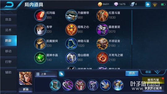 出装:抵抗之靴、暗影战斧、反伤刺甲、魔女斗篷、破军、贤者的庇护