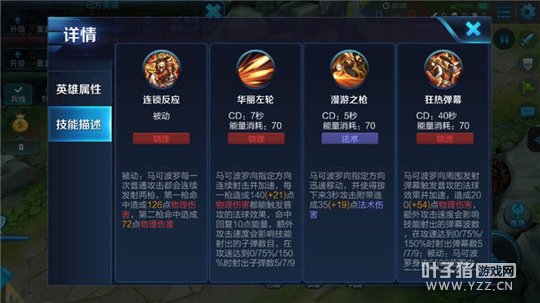 马可波罗向周围发射弹幕,对周围敌人造成伤害,这个技能是一个群体伤害技能,所以马可波罗可以在战场中利用此技能在敌人较多的地方使用。并且使用此技能时拥有加速效果,这使马可波罗在战场中可以更加灵活的在战场中穿梭。被动:马可波罗周围每有一位敌方英雄时会提高自身的属性,马可波罗可以通过这个技能来观察周围是否有敌人埋伏,大大提高了马可波罗的自保能力。