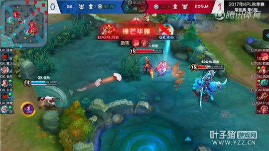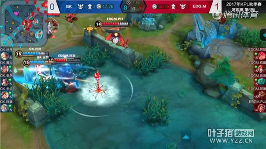 在2017年KPL秋季赛中,GK对战EDG.M,双方在中路发生了一波团战,此时EDG.M的关羽迅速来到团战的位置,并用自己的二技能命中老夫子优先开团,同时老夫子的大招也锁定了关羽,在被老夫子大招锁定的情况下,关羽临危不乱,迅速释放自己冲锋姿态下的一技能将老夫子击退到队友的位置,而后己方李白入场,将老夫子打掉一半的血量。