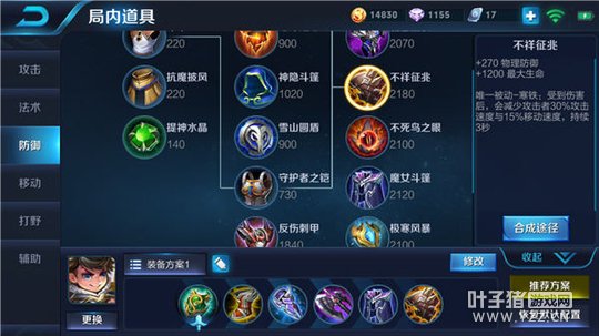推荐理由:先出救赎之翼,刘禅毕竟是一个辅助,需要将经济和经验让给射手发育,救赎之翼能保证刘禅的发育,而提供的护盾在关键时刻可以保命。第二件选择疾步之靴,提高刘禅的移动速度,以便于前期游走带节奏。第三件和第四件选择冰痕之握和暗影战斧,物理防御、生命值、冷却缩减都是刘禅需要的属性,物理攻击和物理穿透提高刘禅伤害能力,而冰痕之握的被动能帮助刘禅更好的打出控制效果。最后两件选择魔女斗篷和不祥征兆,提高刘禅的抗伤害能力。