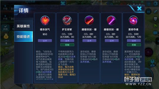 解析:干将莫邪的飞剑攻击会残留两种剑气,可被其他飞剑触发,从而对敌人造成法术伤害。这一效果大大强化了干将莫邪的输出能力,在战场上能让敌人一剑伤、两剑亡,配合二、三技能的超远攻击范围,就可进行安心收割。