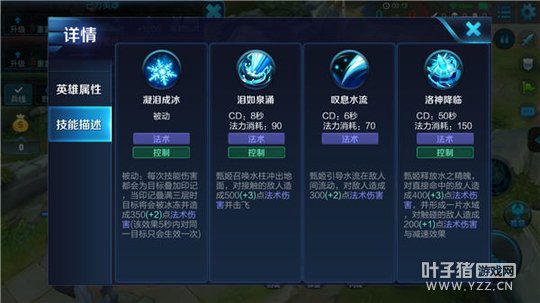 一技能-泪如泉涌:甄姬召唤水柱冲出地面,对接触的敌人造成法术伤害并击飞。