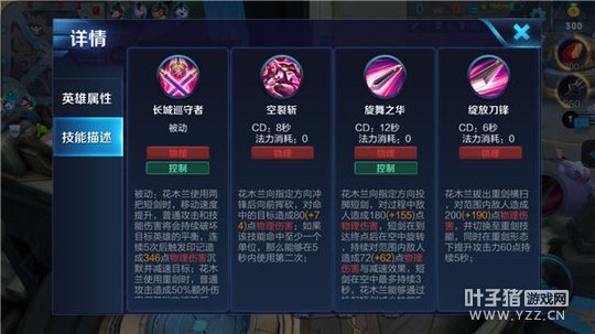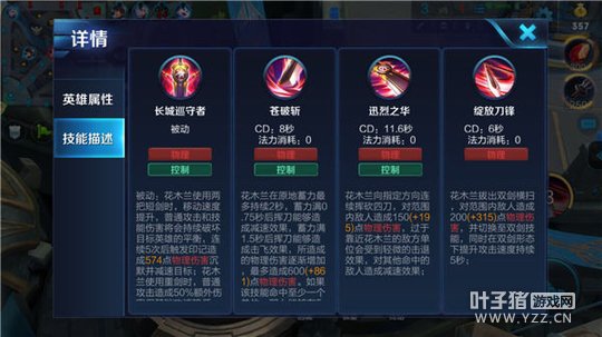 被动技能——长城巡守者:被动技能加强了花木兰的灵活性和生存能力,在双剑形态下,花木兰可以利用技能和普攻迅打出沉默并减速敌人,提高战场击杀率;在重剑形态下,提高自身输出的同时,增加花木兰在战场中所能承受的伤害。