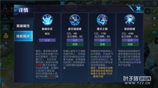 钟馗在受到伤害超过自身生命值百分比时会对周围敌人造成法术伤害,当钟馗在死亡后会引发爆炸,对周围敌人造成高额法术伤害,这个技能提高了钟馗的伤害能力。