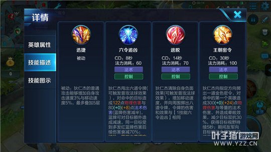 三技能,王朝密令:该技能是狄仁杰的硬控技能,在命中敌人后会造成不俗的伤害和晕眩效果,同时还能减少目标的双抗,并且该技能的冷却时间较短,在必要的时候也可以用来攻击敌方前排,减少目标双抗后便能配合队友轻松将其击杀。但需要注意的是,该技能只能攻击单个英雄,没有穿透效果。