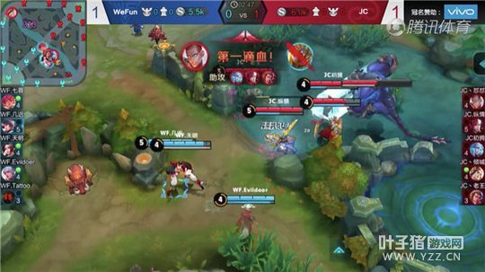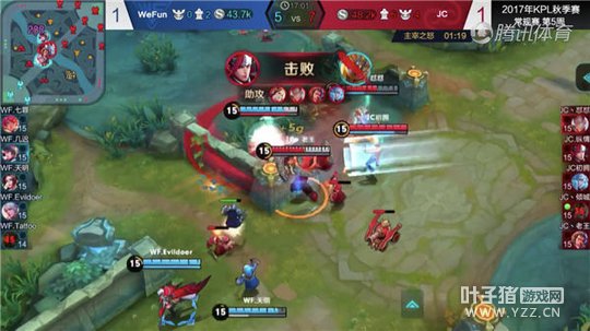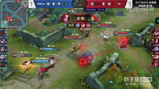 解析:红方在取得一定优势后,不断寻找突破口,想要扩大优势,但蓝方相对保守,几乎没给红方太多的机会。此时,红方集结悄悄接近暗影主宰,并顺利将其击杀,蓝方鬼谷子有所察觉,果断上前察看,但还是略晚一步,同时被红方韩信留住,配合队友的输出,瞬间将其击杀性命,此时红方的优势开始逐渐扩大。