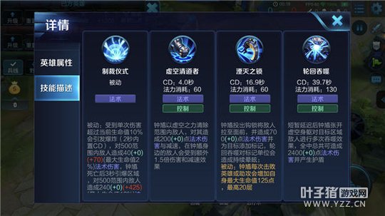二技能-湮灭之锁:钟馗朝指定方向投出钩锁将敌人拉至面前,对其造成法术伤害并为目标添加印记,大招的吞噬效果会对带有印记的目标造成持续晕眩效果。被动:钟馗每次击败英雄或者助攻时,都会增加自身的生命值(可叠加但有上限)。