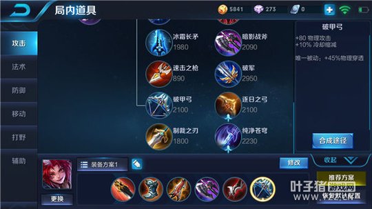 六神装推荐:追击刀锋、急速战靴、无尽战刃、暗影战斧、泣血之刃、破甲弓
