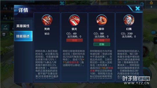 被动技能——死吻:被动技能让阿轲拥有很强的收割能力,在战场中,要通过调整自己的站位,利用背后打出暴击的机制,加快发育、加强收割。