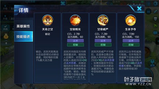 武则天有着强势的对线与团战能力,一技能在打出较高伤害的同时也有着较强的控制能力,二技能可以让武则天在压制敌人时也能够较好的防止敌人的gank,大招的全图性范围伤害与控制效果也让她可以更好的进行收割与团控。