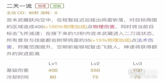 技能解析:宫本武藏跃向空中,在短暂延迟后拔出鸣雷斩落,对目标周围的区域造成物理伤害,同时将当前目标击飞并减速;在接下来的12秒内宫本武藏进入二刀流状态,所有普攻与技能都会附带鸣雷的法术伤害,狩魔范围提升。