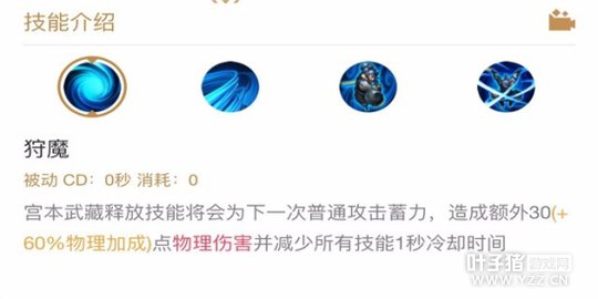 技能解析:宫本武藏释放技能将会为下一次普通攻击蓄力,造成额外物理伤害并减少所有技能1秒冷却时间,宫本武藏被动让其能够减少技能冷却,在一波团战打出多次技能。