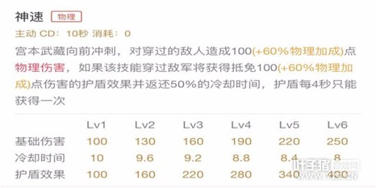技能解析:宫本武藏向前冲刺,对穿过的敌人造成物理伤害,如果该技能穿过敌军将获得抵免伤害的护盾效果并返还50%的冷却时间,护盾每4秒只能获得一次,护盾配合宫本的其他技能,在一波团战中的生存能力大大提高了。