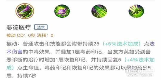 解析:扁鹊的普通攻击和技能都会对敌方施加毒药印记,每秒造成法术伤害;当友方英雄受到二技能的治疗时,会获得一层恢复印记,每秒持续恢复少量生命值。两种印记最多叠加五层,每层印记持续时间为7秒。之前的扁鹊印记持续时间只有五秒,而五秒内扁鹊想要给敌人叠加大量的印记或是给己方恢复较高的血量都是十分困难的,而这次更新将被动技能直接提升到了七秒,可以说是从根本上提升了扁鹊的强度。