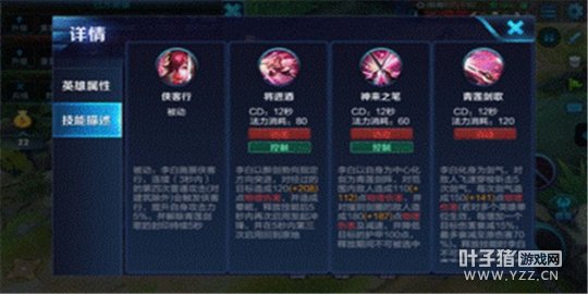 技能解析:李白以醉剑势向指定方向突进,对经过的目标造成物理伤害,并造成晕眩,释放技能后5秒内再次启用发起冲锋,并在5秒内第三次启用回到原地,一技能是李白的位移技能,能够配合二技能和大招来打一套消耗再回到原地,成为敌方脆皮的一个噩梦,在战场上来去自如。