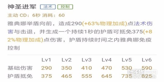 解析:雅典娜短距离位移,形成一个护盾,击退命中敌人并造成一定的法术伤害。护盾持续1秒,护盾持续时间之内免疫控制。该技能用好了可以打断敌人的技能,短时间的击退效果使得敌人来不及反应就倒在了雅典娜的枪下,用完技能后免疫控制可打可逃,护盾可以抵挡敌人伤害。可以说该技能是一个非常有用的辅助技能。推荐次点。