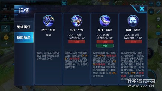 解析:三技能可以帮助兰陵王悄无声息的接近敌方英雄,对其造成致命一击。同时在施放该技能时兰陵王会进入隐身状态,并且隐身时间较长,但在隐身期间接近敌方英雄时间过长或者使用技能便会解除隐身状态。解除隐身状态后兰陵王会获得不俗的攻速加成,输出能力得到提高,可以一套技能将敌方脆皮英雄带走。