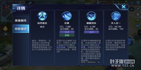 解析:自我增益技能。每秒就自动解控,同时提供2秒的速度加成和伤害免疫。这就让庄周成为了峡谷最自由自在的英雄,几乎很难被控制,同时拥有非常可观的生存能力和机动性。